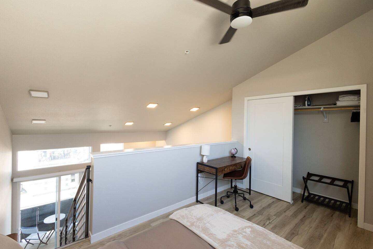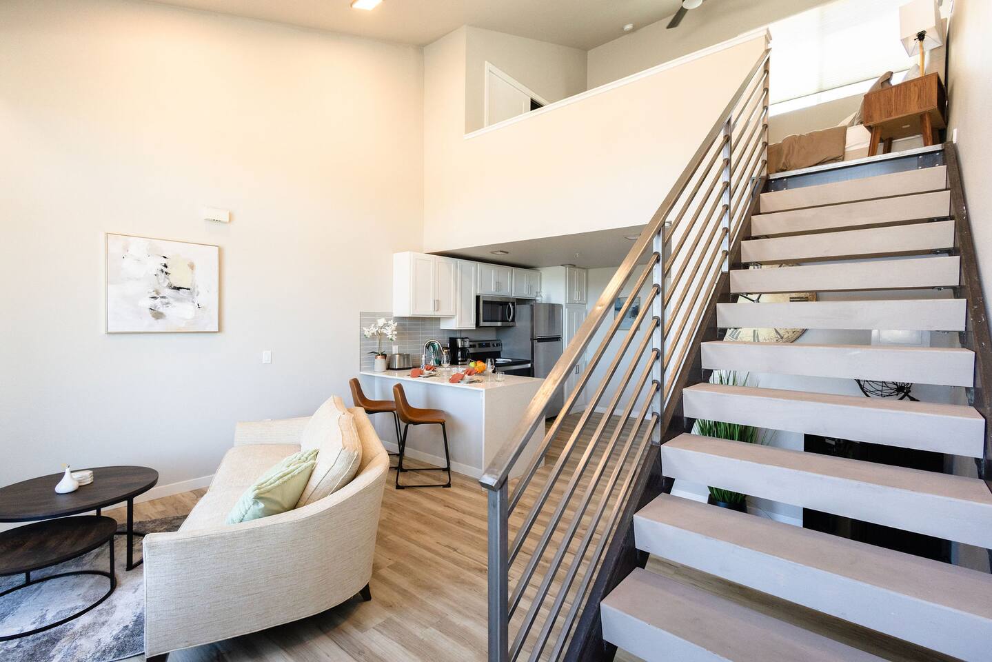 Spanning across two floors, this spacious studio loft apartment offers 662 square feet of stylish living space. Step out onto the private balcony for sweeping views of downtown Reno and the majestic Peavine Peak. It's the perfect spot to unwind and soak in the beauty of Northern Nevada. Step into the thoughtfully designed space, where contemporary aesthetics meet comfort and convenience. The open and airy living area welcomes you with sleek and modern furnishings, with high ceilings, creating a harmonious blend of elegance, warmth and space. Sink into the new and plush Ethan Allen sofa or catch up on your favorite shows on the 55" flat-screen Smart TV that provides access to various streaming apps using your personal logins. The fully equipped kitchen is ready to accommodate all your cooking needs. From light snacks to full-course meals, you'll find state-of-the-art appliances and accessories at your fingertips, including a refrigerator, microwave, electric water kettle, coffee maker, and toaster. Retreat upstairs to the cozy bedroom, featuring a plush queen-sized bed with high-quality 1000 thread count linens. The tranquil ambiance and blackout curtains ensure a restful night's sleep. The bedroom also boasts a working desk, desk chair, two closets with extra linens, and a full-body mirror, catering to both leisure and business travelers. The sleek and modern bathroom on the lower floor offers brand new fixtures and walk-in shower. Fresh towels, toiletries, and a hairdryer are provided for your convenience. For those looking to venture further, we are conveniently located a short drive from stunning Lake Tahoe, the charming Truckee, and the historic town of Virginia City. Immerse yourself in the cultural scene, visit art galleries, or dine at locally renowned restaurants. The convenient location ensures that you're never far from the city's most iconic attractions and landmarks. This modern and stylish loft apartment offers the perfect blend of comfort and convenience. We can't wait to welcome you!