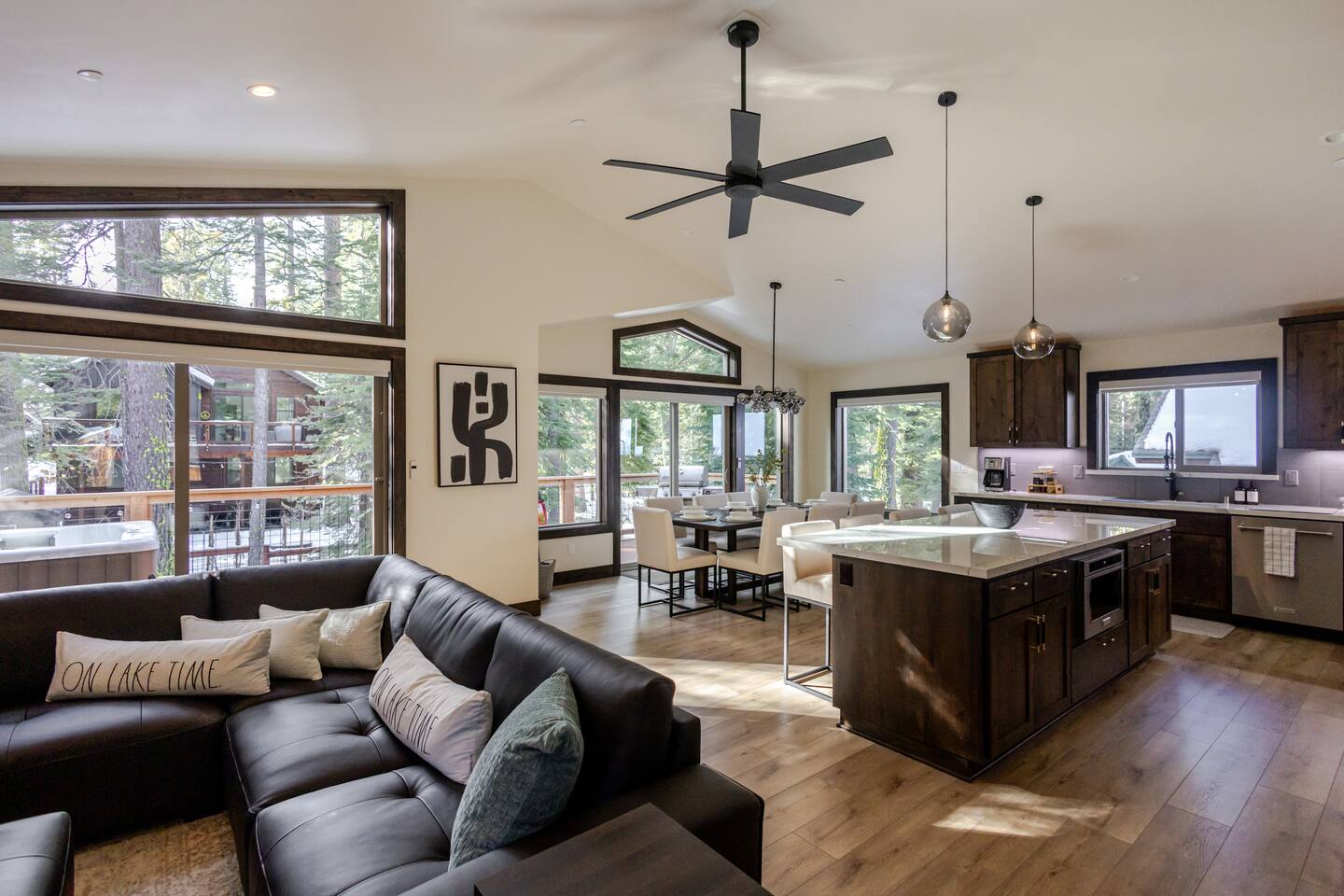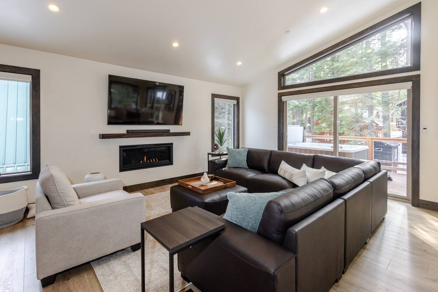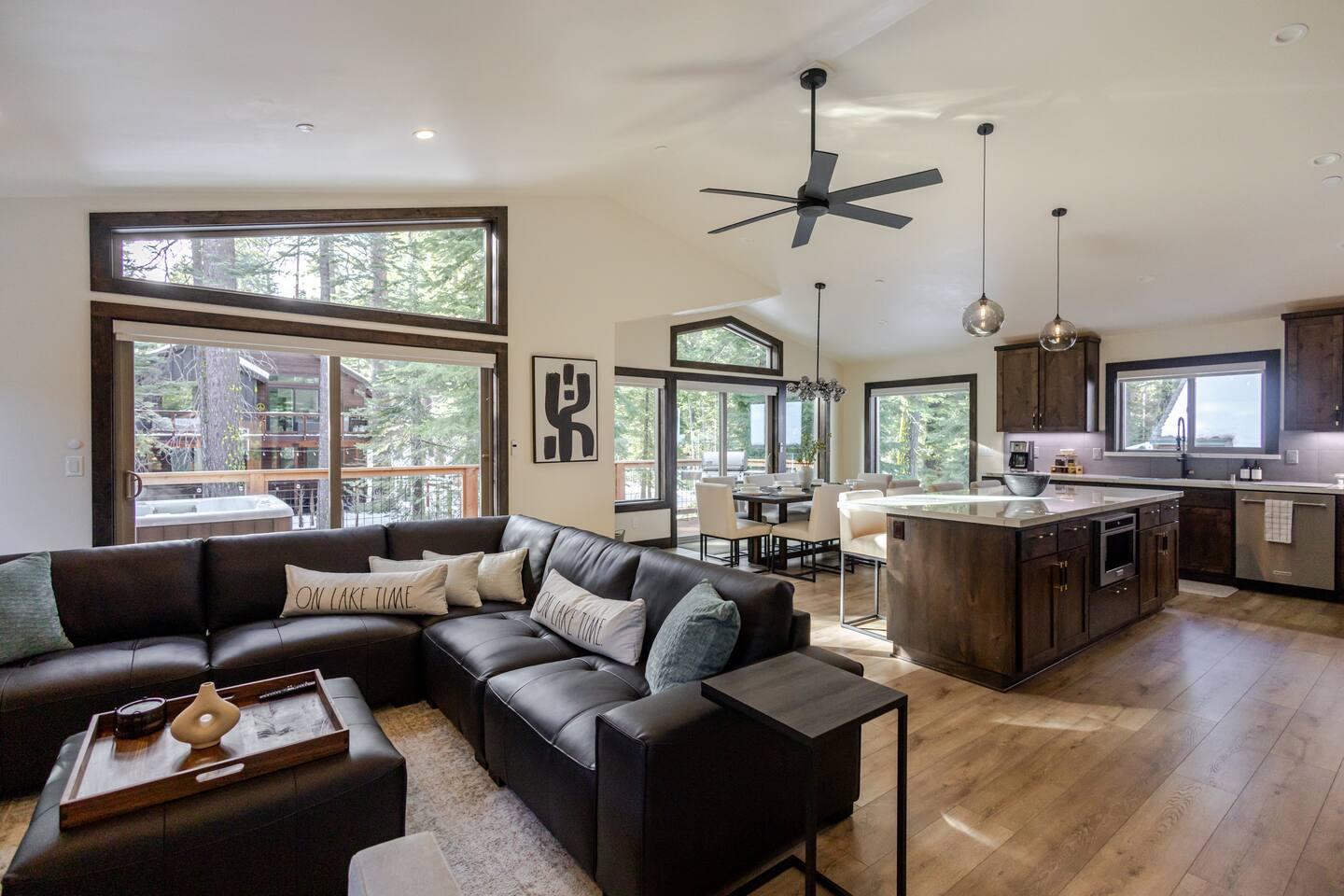 TOP FLOOR: Step into the bright and inviting living area, with a 65” Smart TV, perfect for movie nights or catching up on your favorite shows. The adjoining dining area comfortably seats 8, an ideal spot for family meals or board game marathons. A large island in the kitchen provides seating for an additional 4, making it a convivial space for morning coffee or quick bites. PRIMARY BEDROOM: -King bed with plush bedding -Extra blankets for chilly Tahoe evenings -65" Smart TV -Desk/workstation with a comfy chair -Plenty of closet space -Two robes for your comfort -En-suite bathroom: walk-in shower, dual sinks, soaking tub, complimentary toiletries, fresh towels 2ND BEDROOM: -Queen bed with plush bedding -Extra blankets -Plenty of closet space -Shared bathroom with a modern walk-in shower, sink, complimentary toiletries, fresh towels OUTDOOR DECK: -Hot tub -Grill DOWNSTAIRS: The lower level has two additional bedrooms, a full bathroom, and convenient entry from the garage. 3RD BEDROOM: -Queen bed with plush bedding -Extra blankets -Desk/workstation with a comfortable chair -Private deck via sliding glass doors -Shared bathroom with a modern walk-in shower, sink, complimentary toiletries, fresh towels 4TH BEDROOM: -Two Twin XL beds with plush bedding -Extra blankets -Plenty of closet space -Shared bathroom with a modern walk-in shower, sink, complimentary toiletries, fresh towels ADDITIONAL AMENITIES -Smart lock for easy self check-in/out -Brand-new washer and dryer -Heating and A/C thermostat -High-speed internet -Foldable desk for extra workspace -Coffee maker and electric kettle -Complimentary coffee and tea -Fully stocked kitchen with cooking utensils, cookware, knives, and more -Extra blankets, robes, and wooden hangers for added comfort -Toxin-free toiletries for a healthier stay TOXIN-FREE TOILETRIES: Our provided shampoo, conditioner, body wash, hand soap, body lotion, and dish soap are crafted with the finest ingredients, including cold-pressed argan oil from Morocco, vitamins, botanicals, and Shea butter. These toxin-free formulations are cruelty-free, vegan, organic and free of paraben, sulfate, phosphate, and gluten, for a luxurious and eco-friendly experience for our guests. LOCATION 5 min to Homewood Mountain Resort (skiing, snowboarding, summer activities) 25 min to Palisades Tahoe/Alpine Meadows (world-class ski slopes, hiking trails) 40 min to Sugar Bowl Resort (skiing, snowboarding) 45 min to Northstar California (skiing, mountain biking, village shops) 35 min to Heavenly Mountain Resort (skiing, nightlife, casinos) 5 min to Chambers Landing & Meeks Bay (beaches, kayaking, swimming) 15 min to Tahoe City (restaurants, shops, grocery stores, marina) 15 min to Emerald Bay (iconic views, hiking, photography) 30 min to South Lake Tahoe (casinos, nightlife, entertainment) 45 min to Incline Village (scenic trails, beaches, golf) 15 min to Tahoe City Golf Course (relaxed 9-hole course with beautiful views)